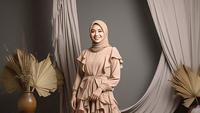 Gamis ruffle berbahan satin jadi pilihan utama Dinda saat tampil dalam acara semi-formal. Warna moka lembut dan desain puff sleeve menambah kesan kalem sekaligus mewah.