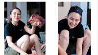 Dalam foto yang diunggah ke Instagram, Ayu tampak aktif berbaur dengan warga dan keluarga saat proses penyacahan daging berlangsung.